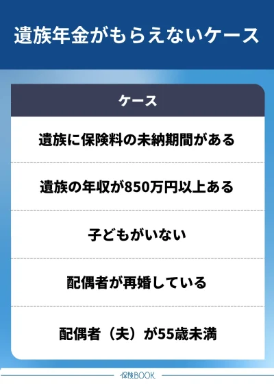 また支給されないケースとして、遺族自身の年収が850万円以上ある場合も注意が必要です。遺族基礎年金の受給は、遺族が生計維持関係にあると認められることが前提で、その判断基準の1つとして所得制限が設けられています。
