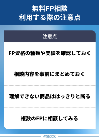 FP相談を利用する際は、できるだけ自分と相性の合ったFPに相談するのがよいです。無料でFP相談をする際の注意点は、以下のとおりです。